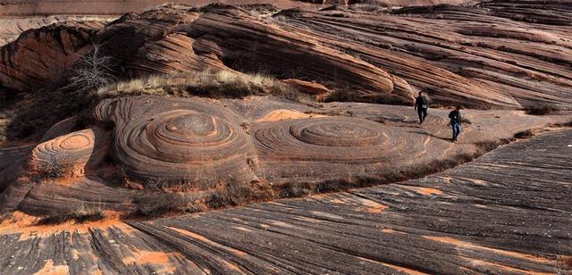 12月16日,游人在志丹县杏河镇丹霞地貌"螺旋谷"参观.