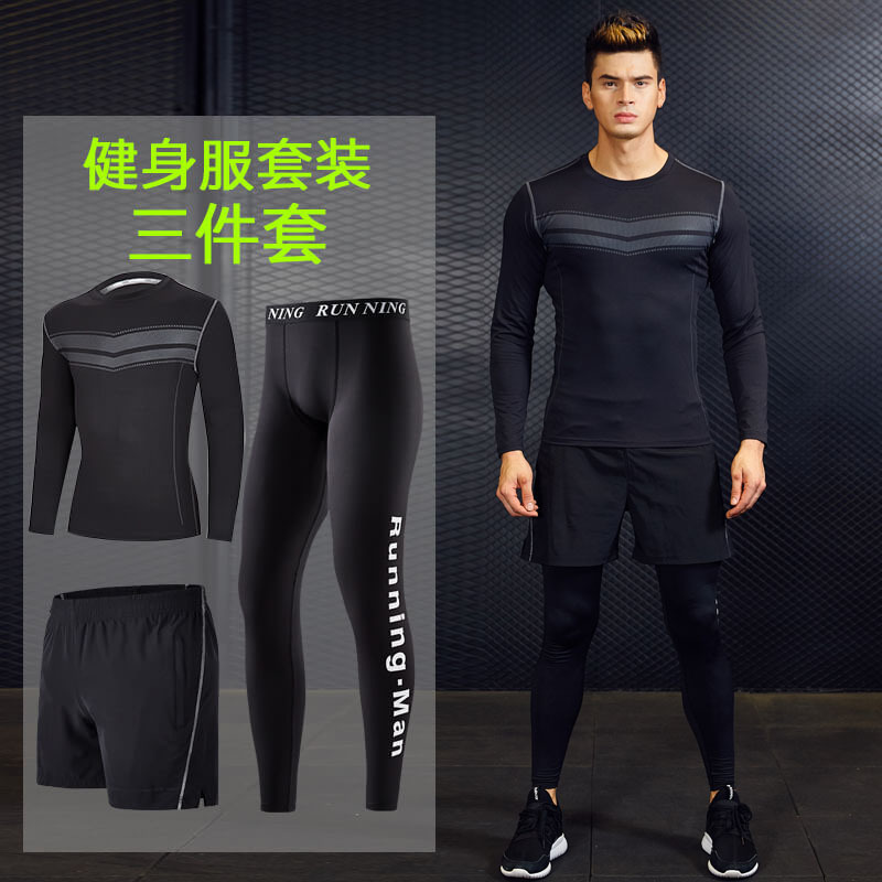 春季新款男士健身运动套装男三件套长袖跑步紧身裤训练紧身衣健身房s