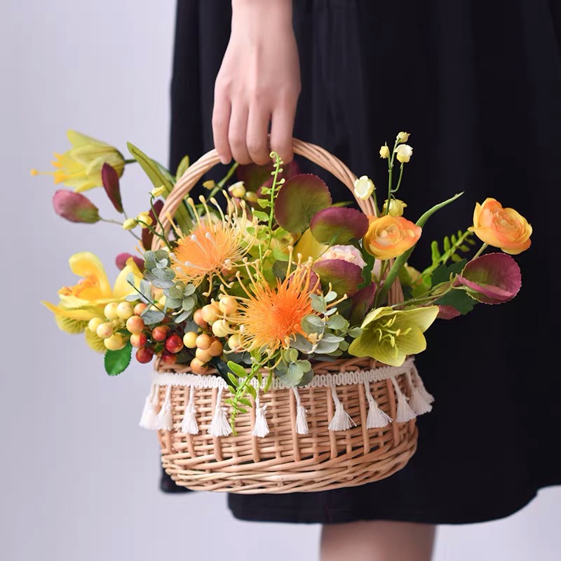 花篮客厅桌面摆件藤编手提插花花篮子竹编花篮单肩背带干花小花篮