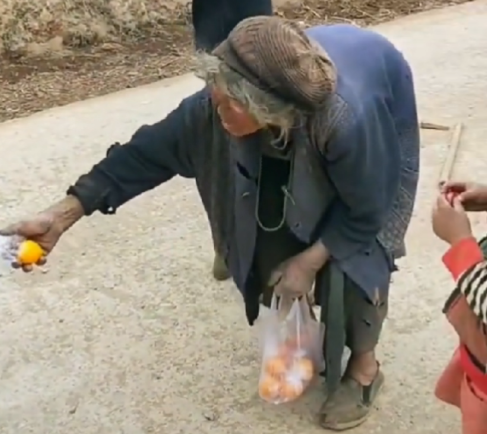 心酸一幕四川孤寡老人身形佝偻衣衫褴褛仍给孩子们分橘子吃