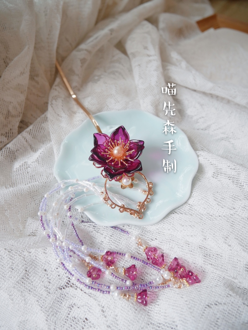 莲花珍珠长流流苏步摇发簪碧玺紫色优雅仙气发饰