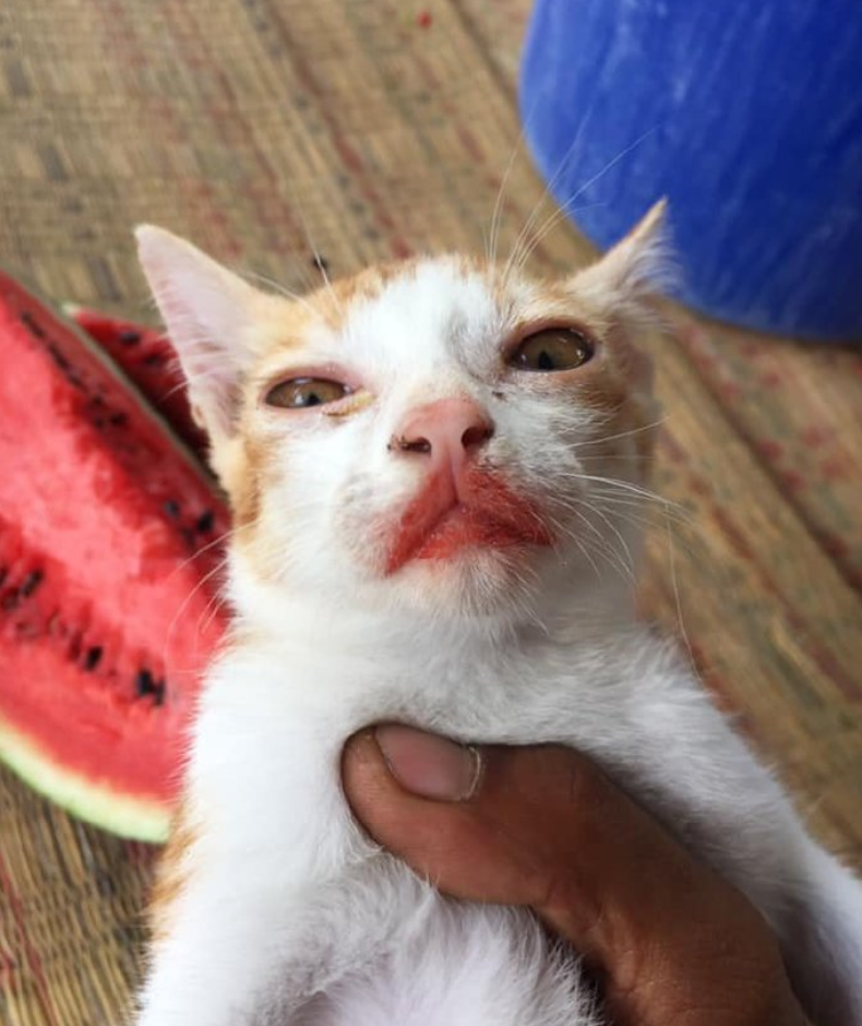 小猫咪偷吃西瓜,嘴唇都被染红了,网友:这口红色号不错