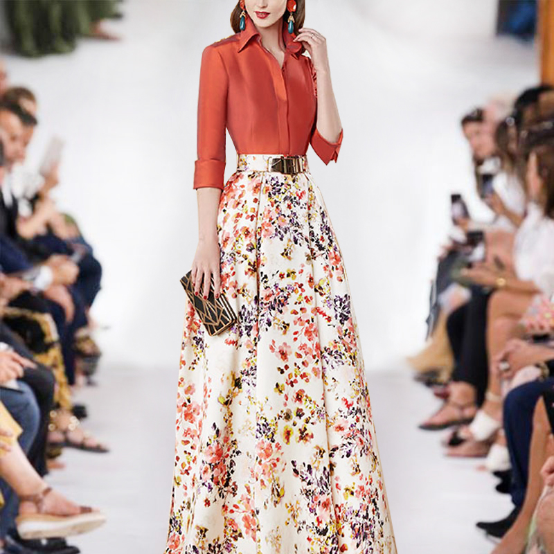 欧洲站2022年春季明星走秀新款高端女装印花套裙时尚两件衬衫套装