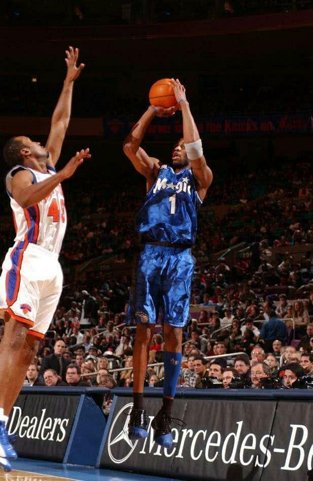 麦迪的投篮动作十分销魂,高高拔起后在最高点出手,篮球划出完美的弧线
