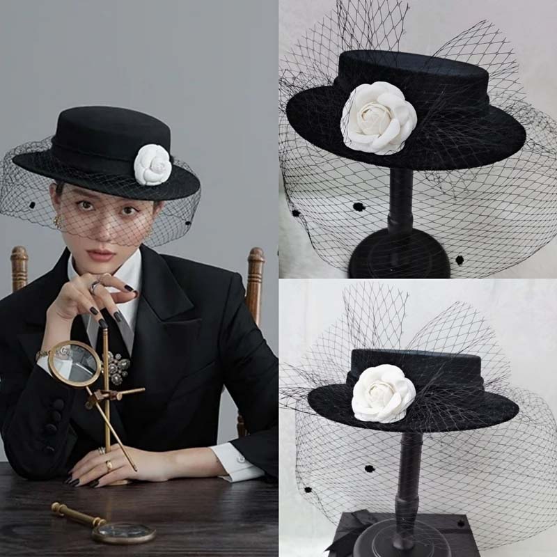 英伦法式优雅雅极黑色丝绒缎带赫本礼帽写真帽子