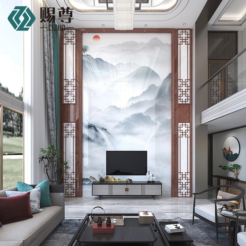 别墅复式楼电视背景墙岩板大理石客厅挑空电视墙新中式实木影视墙
